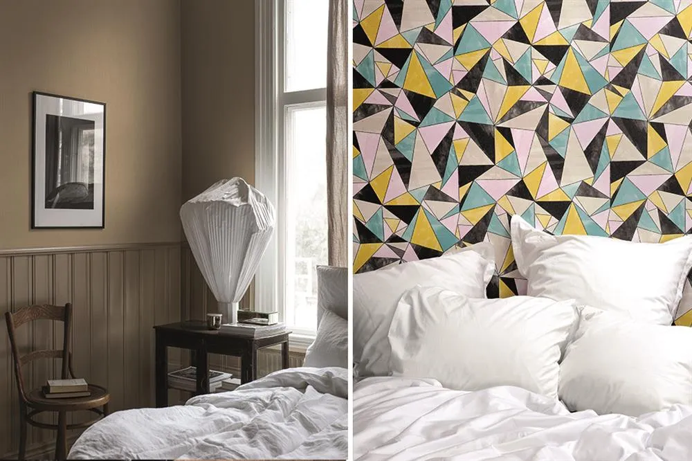 Jos haluat suurikuvioisen tapetin, mutta haluat säilyttää rauhallisen tunnelman makuuhuoneessa, voi olla hyvä idea tapetoida seinä sängyn kohdalta. Se toimii vähän kuin ylisuurena sängynpäätynä – saat tuotua kuvioita ja värejä huoneeseen, mutta tapetti ei näy niin paljoa sängyssä ollessasi.