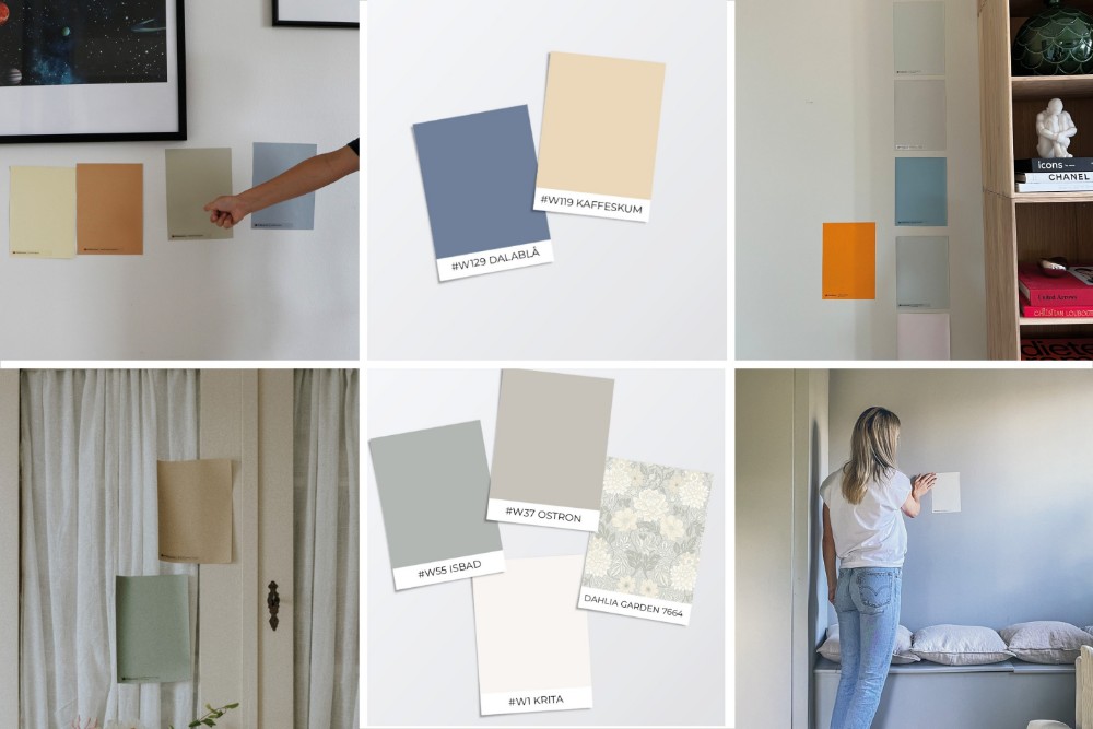Kaikista tyyleistämme ja tyyliehdotuksistamme voit ostaa maali- ja tapettinäytteitä. Maalinäytteet on maalattu käsin itseliimautuvalle tarrapaperille, jota on erittäin helppo siirtää eri paikkoihin, jotta lopputulos on helppo hahmottaa. Voit ostaa yksittäisiä värinäytteitä, koko paletin tai valmiin värisetin.